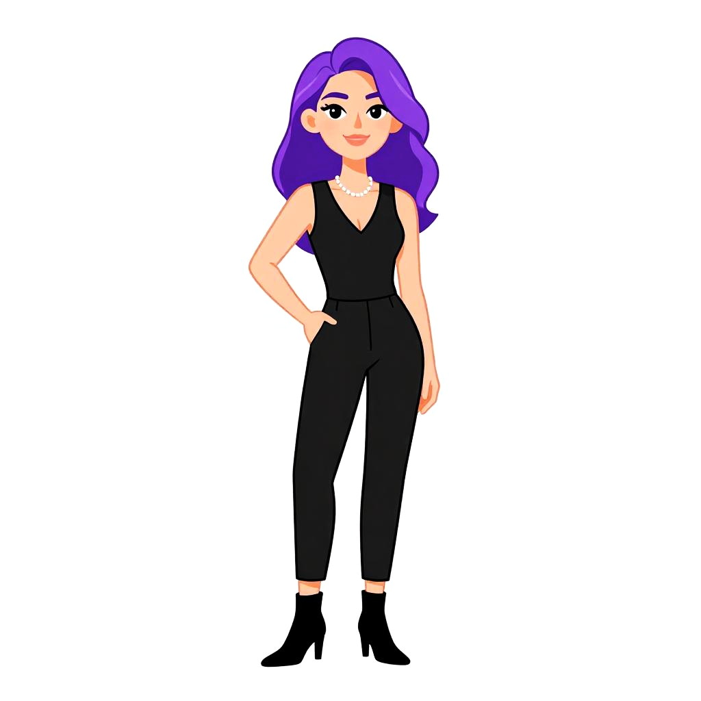 Digital illustration of a confident woman with vibrant purple hair, wearing a black dress, sheer long sleeves, and black boots, standing against a white background.