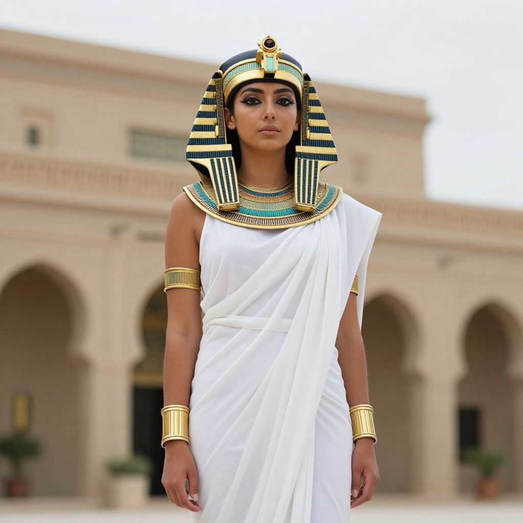 Egyptian toga costume, a woman in a white dress and gold jewelry stands in front of a building