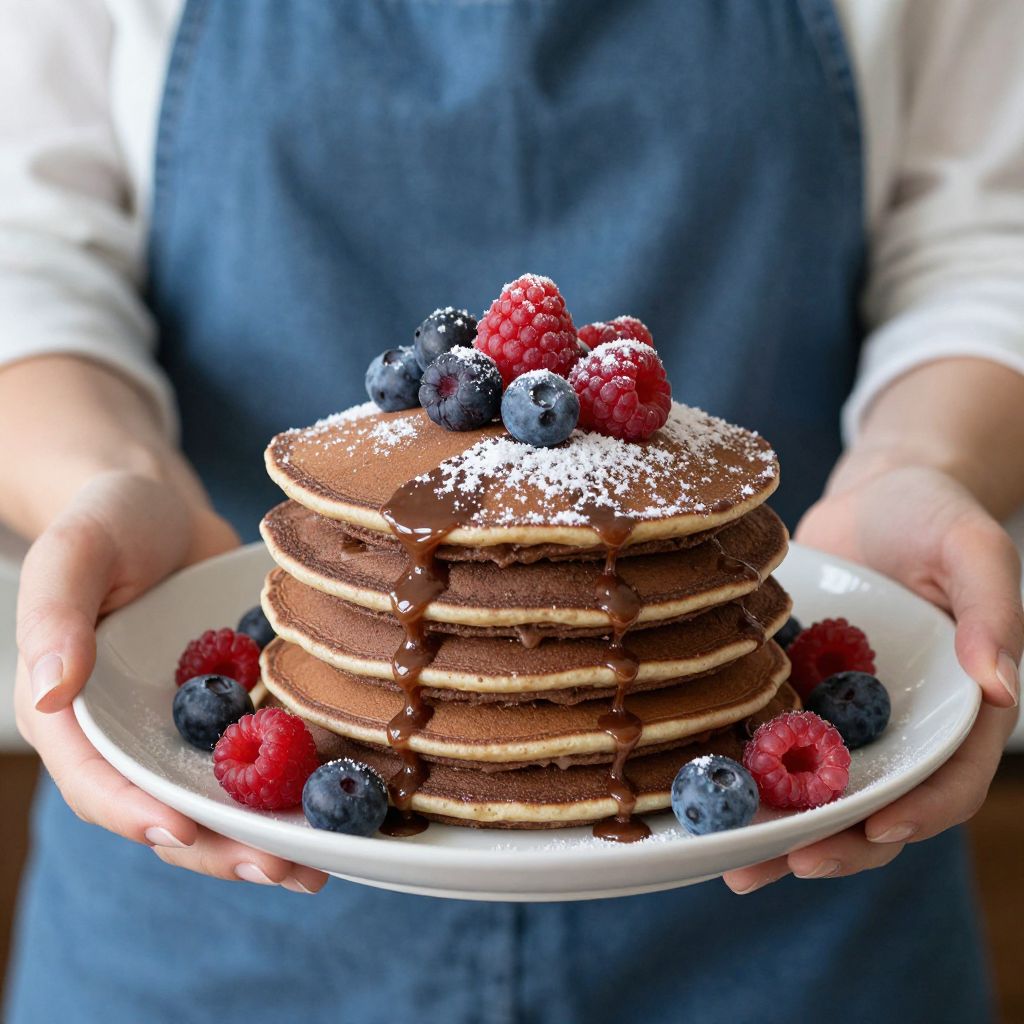 A woman in a blue apron holds a plate of delectable chocolate pancakes topped with fresh berries and powdered sugar, captured in a close-up, high-definition stock photograph showcasing vibrant colors and appetizing textures.