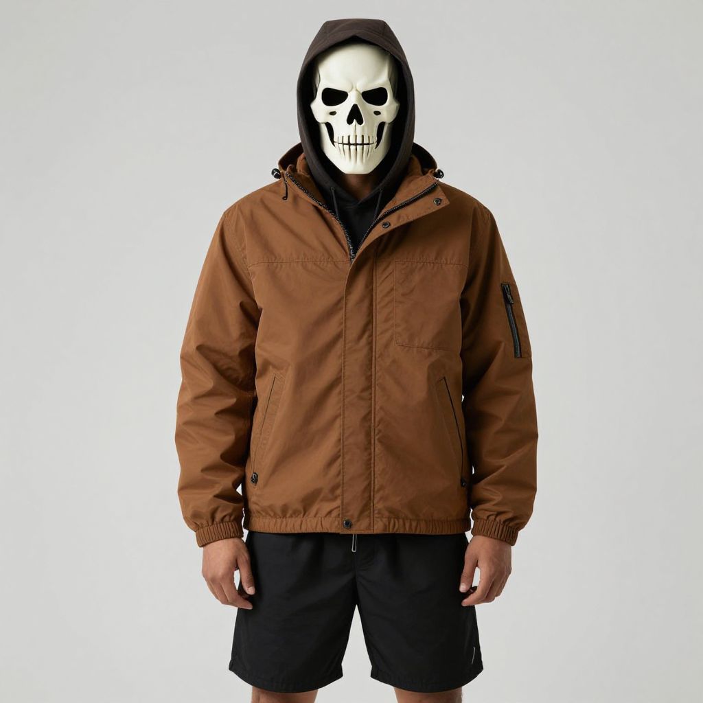 Man with a skeleton mask on his face, wearing a brown jacket with a hood and black shorts.