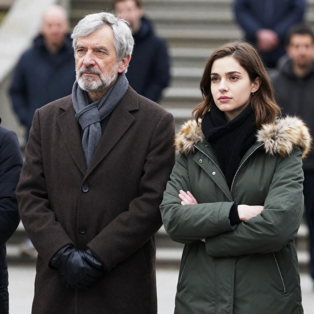 Photograph of a middle-aged man and woman standing outdoors. Man has balding head, gray beard, green jacket, blue scarf, serious expression. Woman with brown hair, smiling, wearing white cardigan, black and white checkered scarf. Metal wire fence in background. Both facing forward.