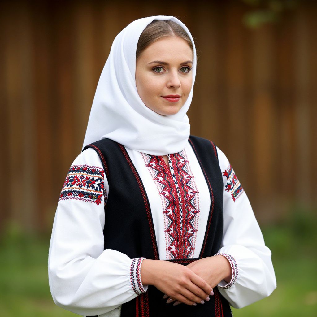 "Ukrainian Folk Dress Traditional, woman in a traditional dress with a white head scarf"