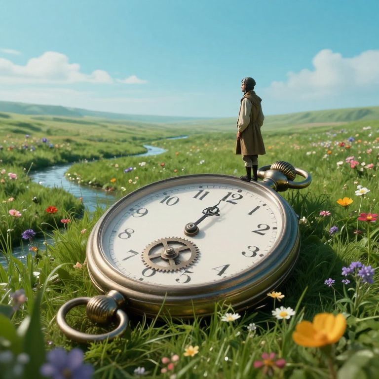 An ethereal surrealist landscape captures the essence of dreamscapes, where time appears to pause in a tranquil meadow adorned with vibrant flowers and shimmering streams. From an elevated viewpoint, viewers witness an oversized pocket watch lying flat against the lush greenery, its silver gears slowly rotating amidst the azure sky. A solitary figure clad in vintage aviator attire stands atop this mechanical wonder, their gaze fixed upon the horizon as if lost in contemplation. This enchanting scene evokes a sense of nostalgia and introspection, inviting audiences to explore the enigmatic nature of time and the hidden depths of our subconscious minds.