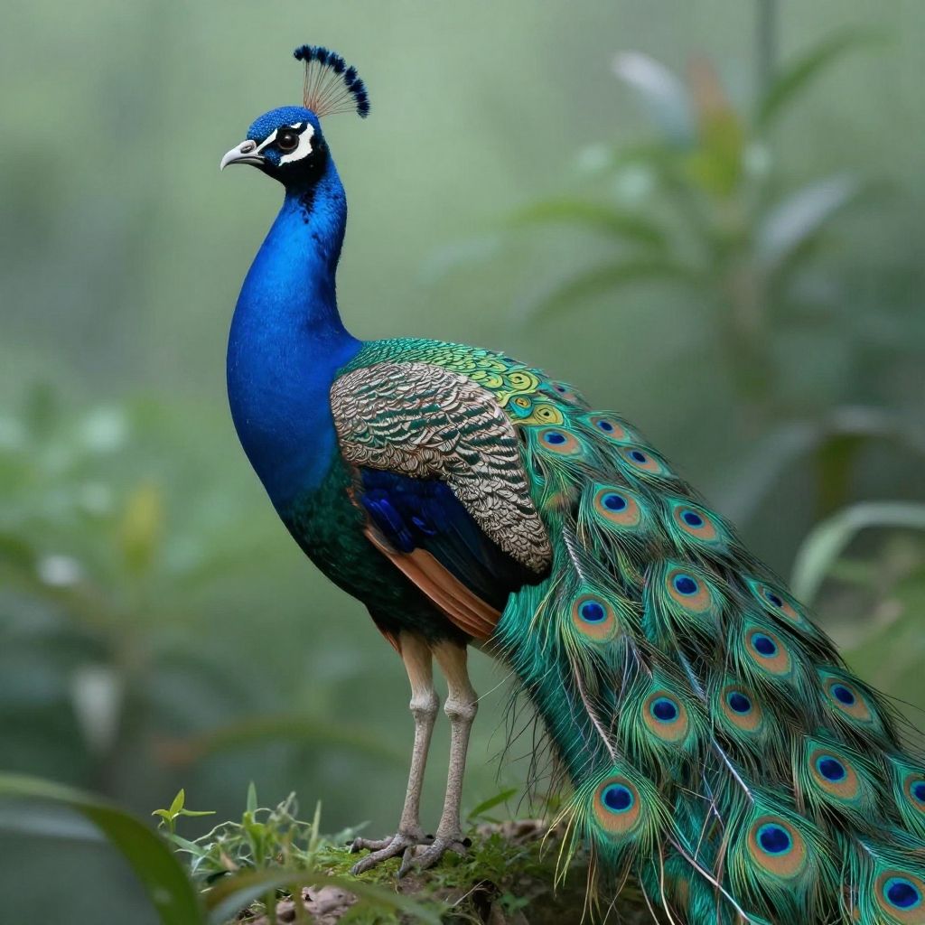 Digital illustration of a vibrant peacock with a blue-green head, iridescent feathers, and a long, patterned tail, standing among large green