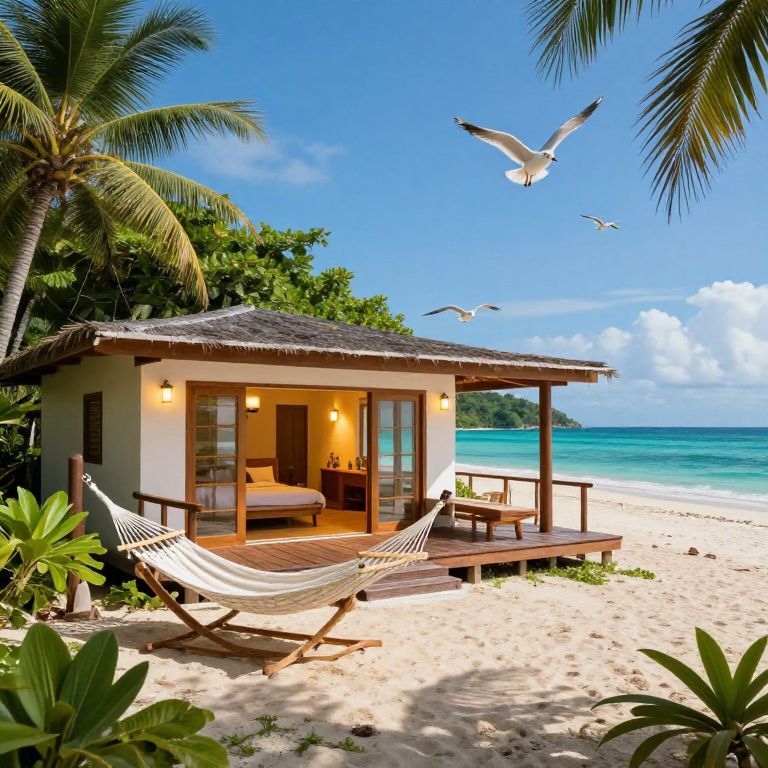Photograph of a tropical beach bungalow with white walls and a thatched roof. The small house has large glass sliding doors revealing a cozy interior with a bed and wooden furniture. A white hammock hangs in the foreground on a wooden deck. Palm trees frame the scene on the left, while vibrant green foliage surrounds the bungalow. Two seagulls soar in the bright blue sky above turquoise waters and white sand. The image exudes a peaceful, tropical paradise vibe.