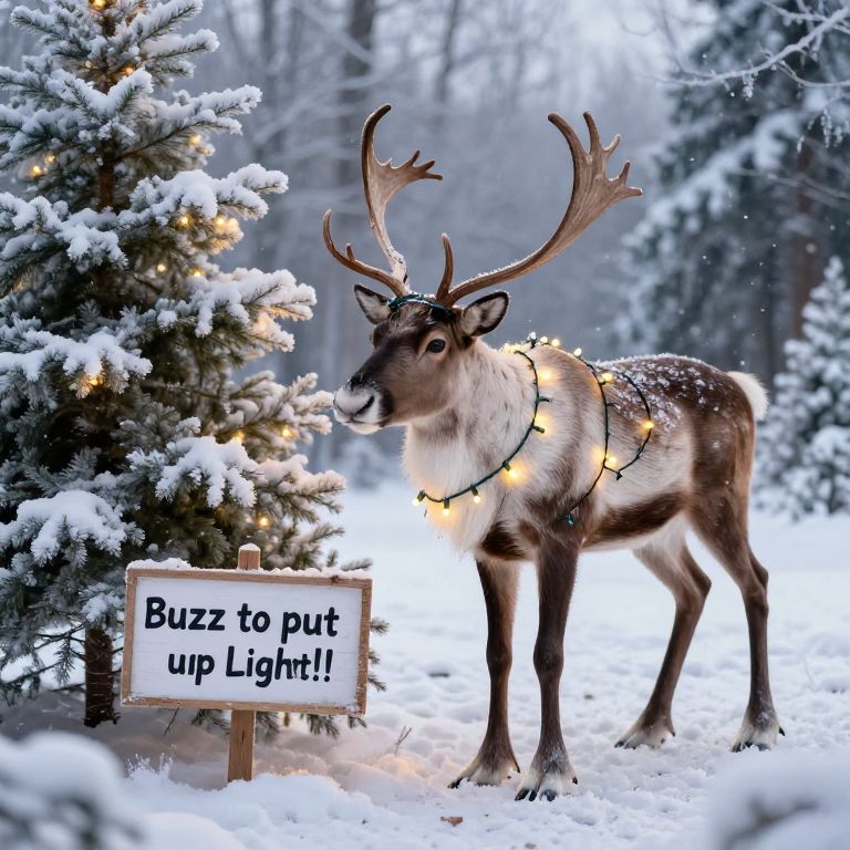 A reindeer standing in a snowy meadow wrapped in glowing Christmas string lights. Snow-covered pine trees decorate the background, with one tree also adorned with lights. A small wooden sign in the snow reads 'Buzz to put up Lights!!' The scene depicts a festive winter atmosphere with frost, ice, and soft lighting highlighting the detailed fur of the reindeer.