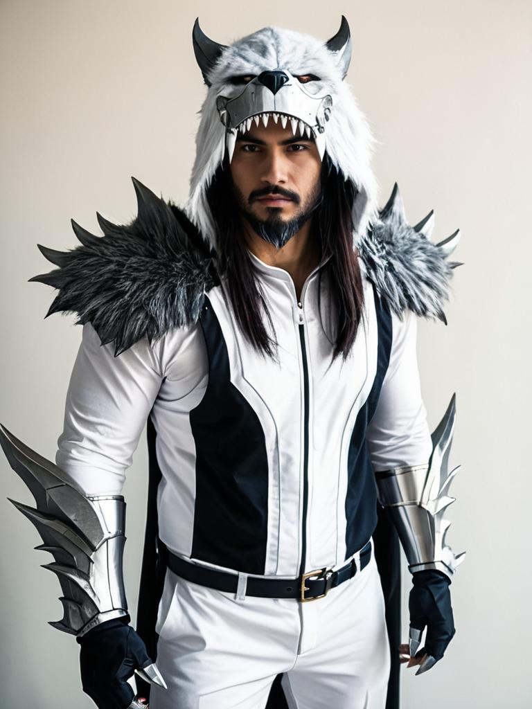 Portrait of a man wearing a detailed Silver Fang cosplay costume, featuring a white and black fitted suit with fur shoulder pads, metallic spiked gauntlets, and a wolf-themed headpiece with sharp teeth and horns. The man has long dark hair and a serious expression, emphasizing the fierce character portrayal.