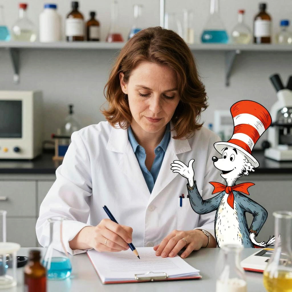 Realistic photo.colorful and humorous book illustration of a chemistry professor who resembles Tina Fey, working in a laboratory, with light brown hair, in the whimsical style of Dr. Seuss, Anton Pieck, and Kat Tzingounakis, funny and playful realistic photo