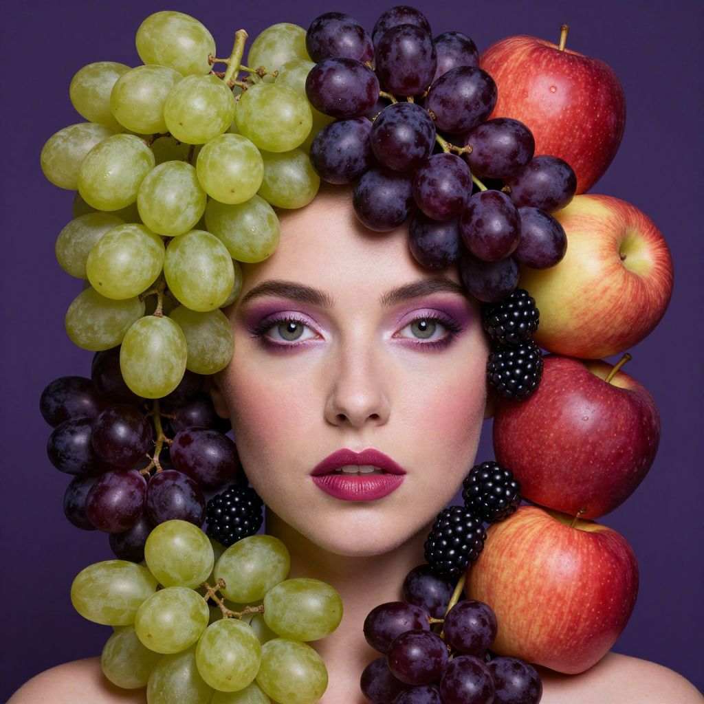 Photographic portrait of a fair-skinned woman with striking purple eyeshadow and dark pink lipstick. Her head is adorned with clusters of green and purple grapes, blackberries, and red apples. The background is a solid dark purple, highlighting the vibrant colors of the fruits. Her expression is neutral, with a slight upward gaze. The composition is surreal, blending the woman's face seamlessly with the fresh produce, creating a visually striking and imaginative image.