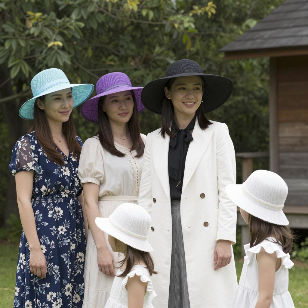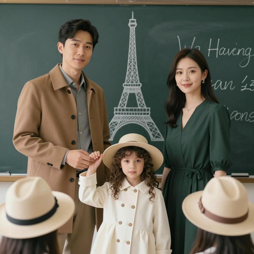Family photograph of four people standing closely together outdoors at night. Woman with red hair in white dress, curly-haired girl in blue sweater, man in gray suit with black tie, and older man in black tuxedo with bow tie. Background has red lanterns, wooden structure, and dark green foliage. Man in suit stands in center, others on sides. Lanterns hang from structure above.