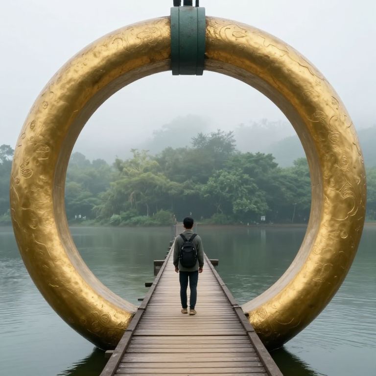 Photograph of a man standing on a wooden pier, viewed from behind, as he walks towards a large, golden, circular sculpture that frames a misty lake. The golden sculpture, with intricate embossed patterns, is centered at the image's top, creating a circular frame around the man. He wears a black jacket and backpack, and the lake reflects the overcast sky and surrounding green trees. The mist adds a dreamy, ethereal quality to the scene, with the water appearing calm and still. The overall composition is symmetrical and serene, emphasizing the contrast between the golden sculpture and the natural, tranquil environment.