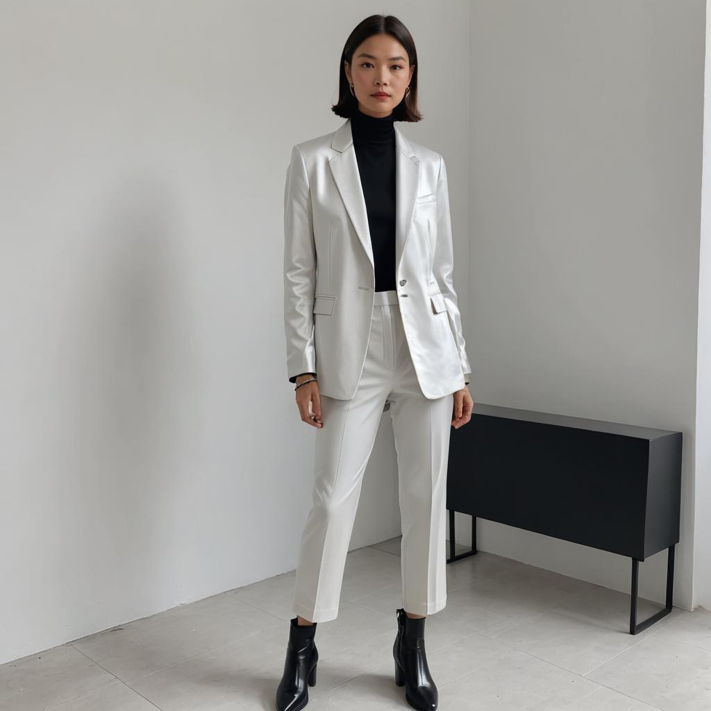 Photo of a Petite woman, Sleek Bob, minimalist outfit, monochrome palette, neutral tones, sleek lines, tailored Metallic Silver blazer, white cotton t-shirt, black slim-fit High-Waisted Trouser trousers, leather boots, minimalist watch, modern, understated elegance, Stylish Boutique, Fashion Photography