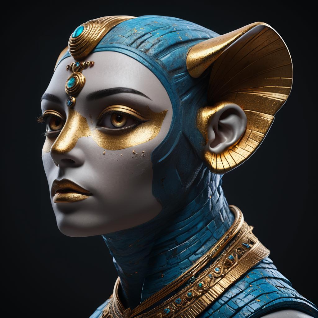 Portrait of a woman with flowing dark brown hair and piercing hazel eyes, adorned in golden wings and intricate gold jewelry with blue gemstones. She wears a metallic gold top and matching arm bands under dramatic lighting that highlights the shimmer and vivid colors, creating a hyper-realistic and captivating image with an ethereal and mysterious atmosphere.