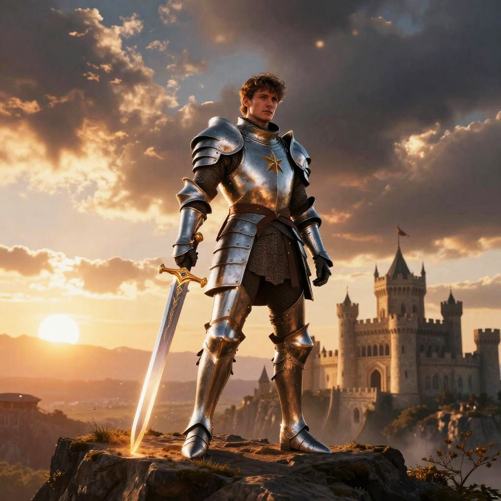 Hero prompts depicting a valiant warrior standing atop a cliff at sunset, clad in shining armor, wielding a glowing sword, with a majestic castle in the background and a dramatic sky filled with swirling clouds.
