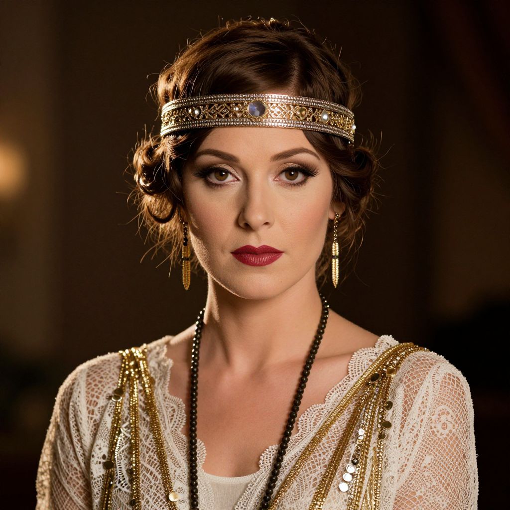 A high-definition digital portrait captures a woman in a 1920s-inspired ensemble, featuring intricate lace detailing and vintage accessories, evoking the glamour of the Gatsby era with dramatic lighting and a timeless aesthetic.