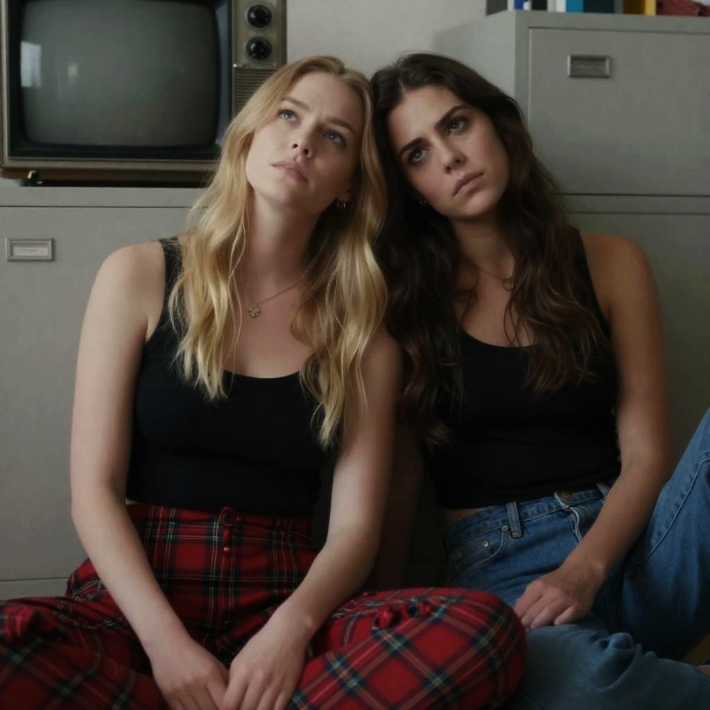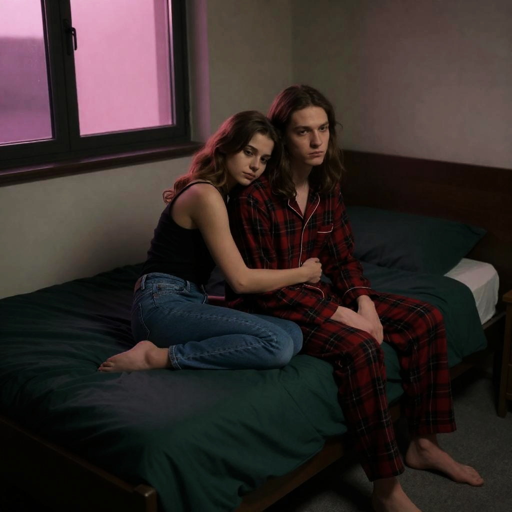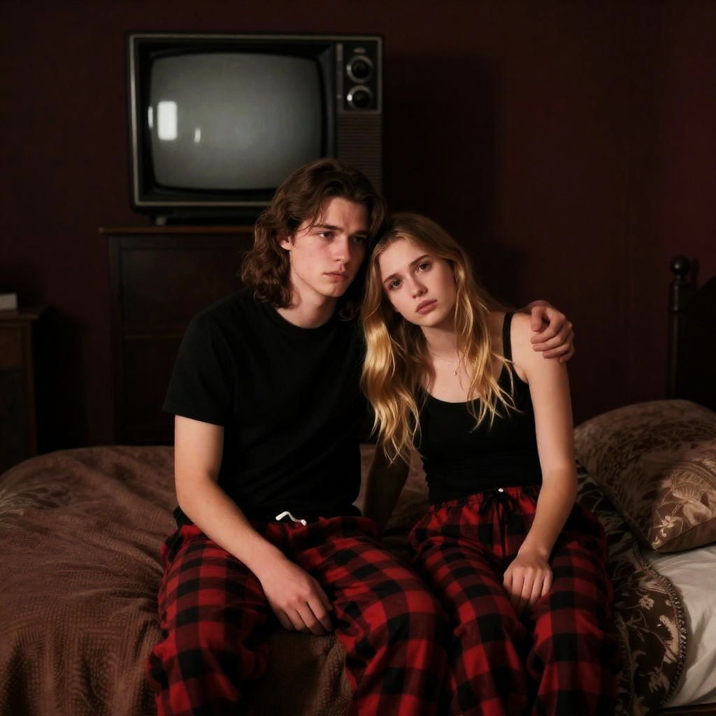 Photograph of two young people sitting closely on a bed in a dimly lit room. The man with long brown hair, wearing a black shirt and red plaid pajama pants, has his arm around the woman. The woman with long blonde hair, wearing a black tank top and red plaid pajama pants, leans against him. They both look anxious. Behind them, a large, black, vintage television set with multiple screens is mounted on the wall. The bed has brown and patterned blankets. The room has dark, ured walls.