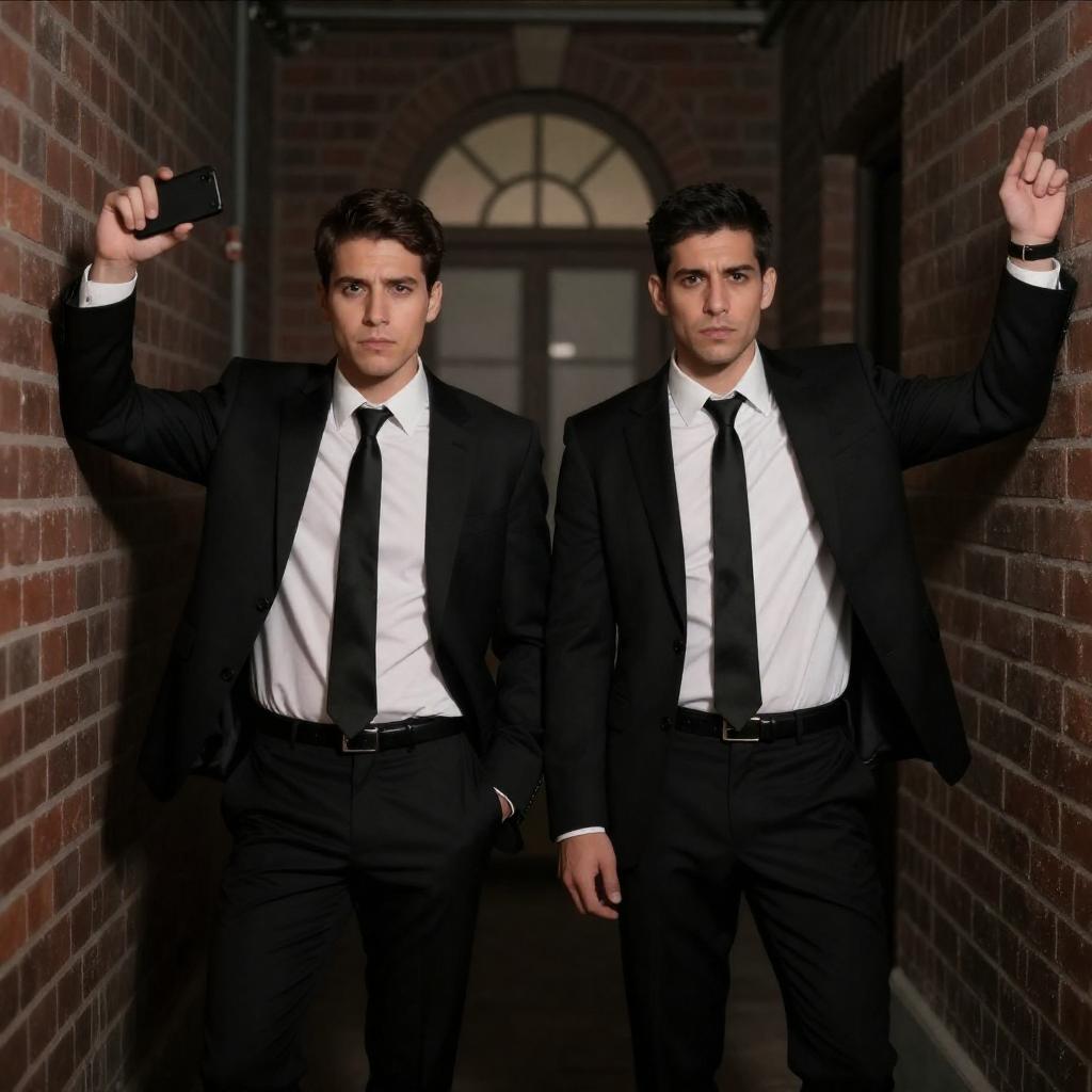 Two men leaning on a black wrought iron balcony railing. Left man in white robe, short dark hair, serious expression. Right man in blue denim shirt, long dark hair, neutral expression. Orange stucco building with wooden beams, windows behind.