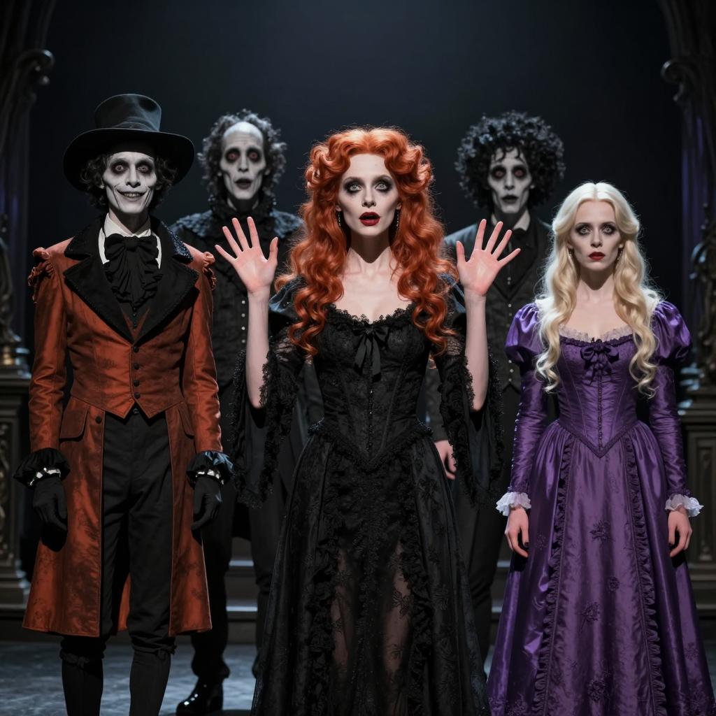 Photograph of a theatrical scene. Central male character in green and black clothing raises a cup, surrounded by a diverse group of people in medieval and fantasy attire. Background features mountainous landscape. Characters have varied expressions, some cheering, others looking on. A horse stands to the left. Characters wear ornate robes and armor. Mountainous backdrop with cloudy sky.