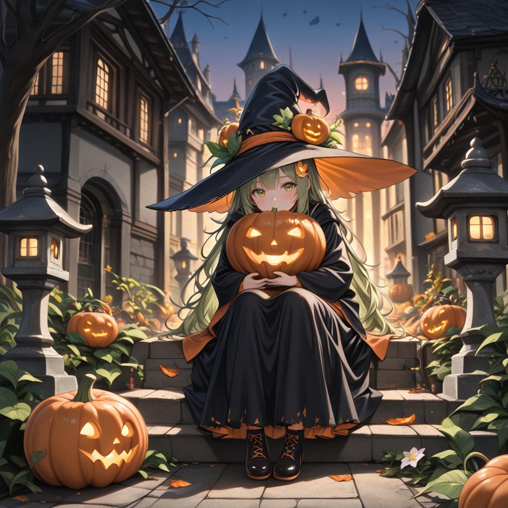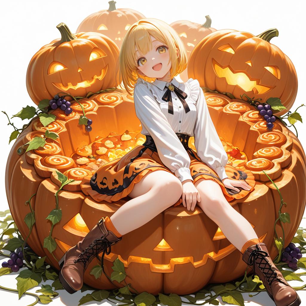 Solo, 1girl, deep-yellow hair, medium bob cut, orange-colored eyes, brown boots, happy, :D, white shirts, orange-colored balloon skirt, sitting on big pumpkin tart, (pumpkin tart:1.4), pumpkin-pie, many pumpkins, grape vines, childbook, [(WHITE BACKGROUND:1.5), ::5] HEXAGON