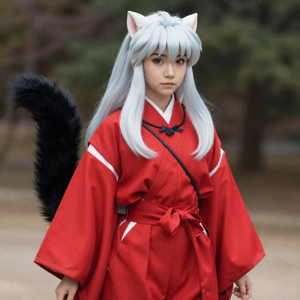 Inuyasha Sango Cosplay, girl in a red kimono with a black cat tail
