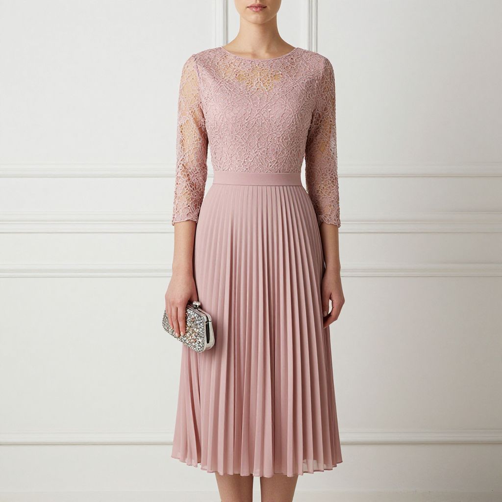 Photograph of a woman in a pink lace long-sleeve dress with a pleated skirt, holding a sparkly clutch, standing against a white