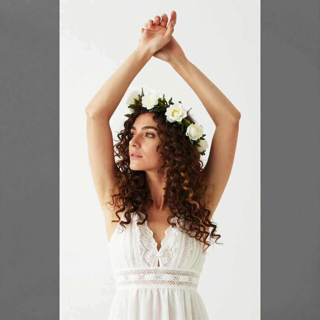 Photograph of a young woman with long, curly brown hair wearing a white floral crown with white and green flowers. She has a light olive skin tone and is dressed in a white, sleeveless, lace-trimmed dress with a deep V-neck. Her arms are raised above her head, hands clasped together. She has a serene expression with slightly parted lips and is gazing to her right. The background is a solid white, creating a stark contrast with the gray borders on either side. The image is brightly lit, emphasizing the softness of her dress and the natural texture of her hair.