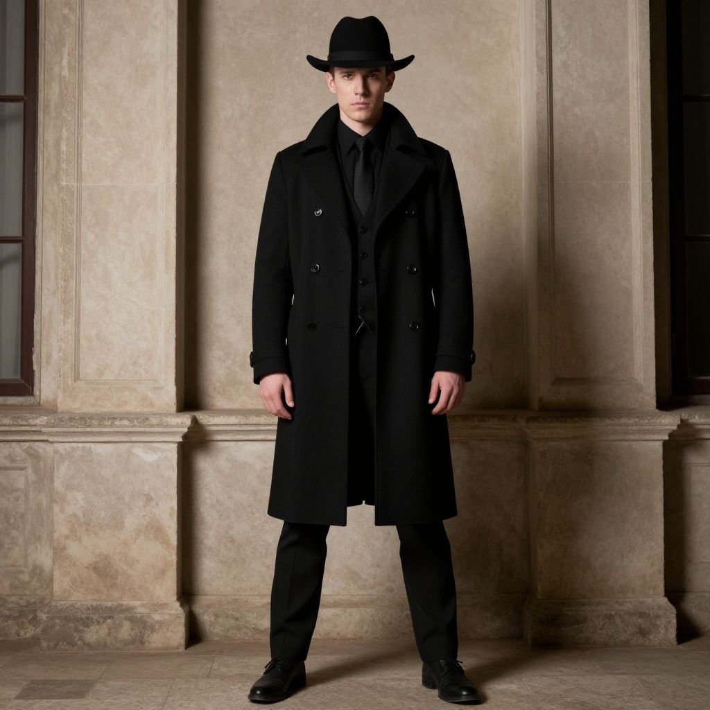 Photograph of a young Caucasian man with fair skin and a lean build, standing in front of a textured beige stone wall. He wears a black wide-brimmed fedora, a black double-breasted overcoat, a black shirt, and black trousers. His black shoes are polished. The lighting casts soft shadows, emphasizing the textures of the stone wall behind him. He stands with a neutral expression, hands relaxed at his sides, centered in the frame. The overall style is reminiscent of classic noir or detective fiction.