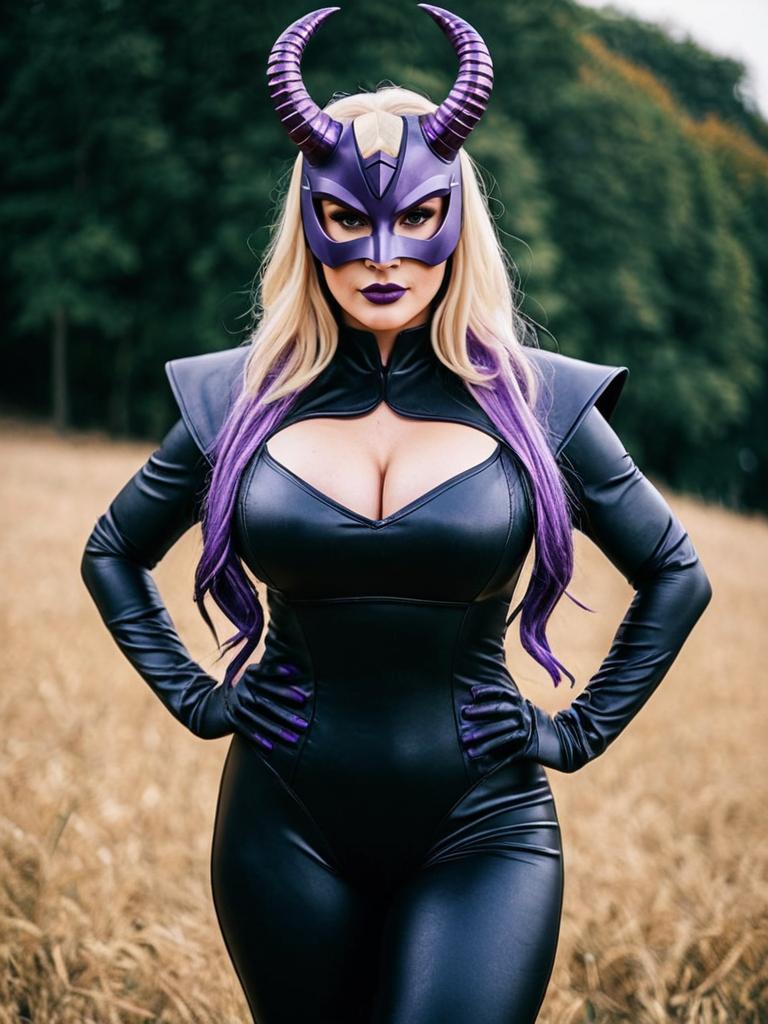Photo-realistic cosplay photo of person standing in mount lady costume. 1girl, giantess, horns, purple horns, red eyes, purple eyes, blonde hair, long hair, drill hair, large breasts, ass, domino mask, bodysuit, superhero costume, superhero costumefull body shot. lifestyle stock photo, shallow depth of field, lifestyle stock photography, shallow depth of field, natural lighting, warm tones, soft background blur, vibrant colors, realistic textures