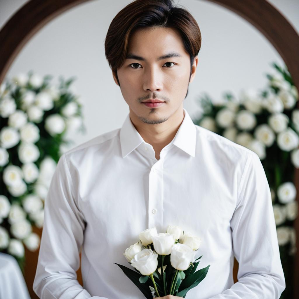 Civil wedding attire groom,male focus, 1boy, necktie, flower, realistic, suit, formal, white flower, looking at viewer, outdoors, shirt, pants, blurry background, blurry, jacket, facial hair, vest, white shirt, solo, arms at sides, collared shirt, brown necktie, solo focus, brown hair, mustache, asian, white suit, standing