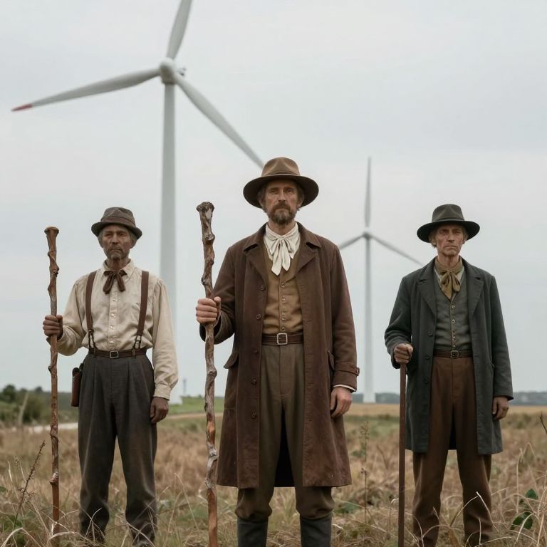 Statuesque figures clad in vintage attire stand solemnly amidst a field of wind turbines, their weathered forms holding rustic staffs, creating a hauntingly surreal tableau where history and modernity converge in an otherworldly landscape.