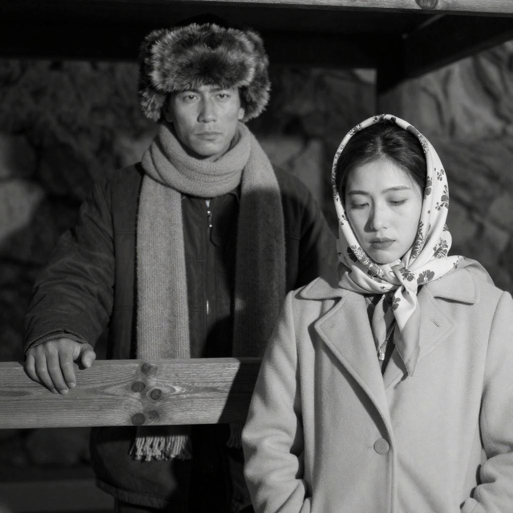 Black and white photograph of two men in winter clothing. Foreground man, dark coat, fur hat, scarf, leaning forward, serious expression. Background man, lighter coat, headscarf, looking upward, relaxed expression. Both seated on grassy mound, bare tree branches to the right.