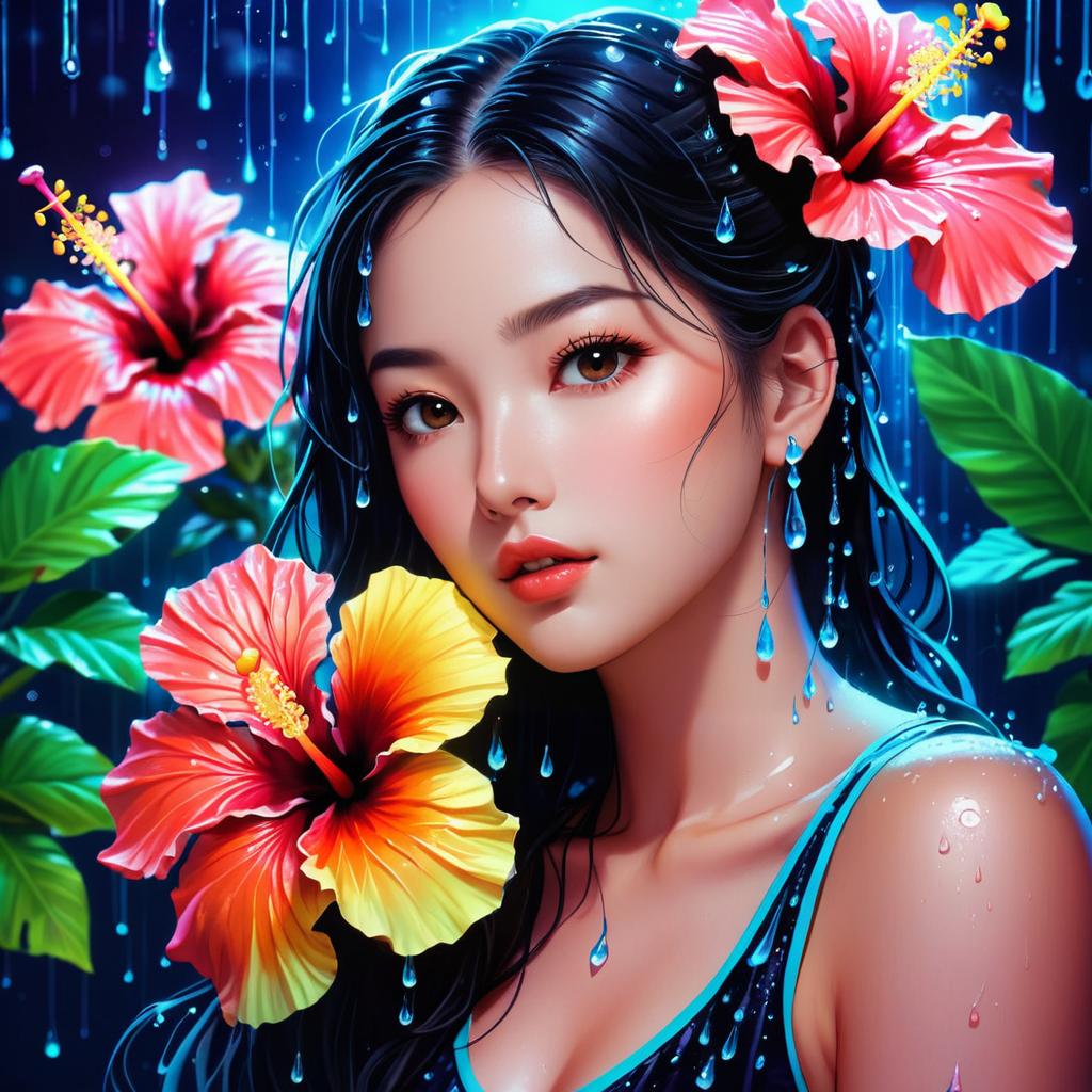 1girl, hibiscus Moon with water drops, neon glow, random background, bokha mood