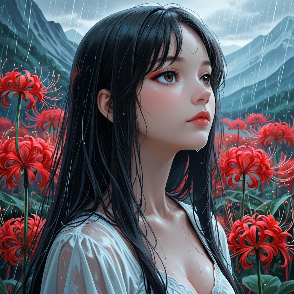 Photograph of a wet-haired woman with dark eyes, surrounded by vivid red hibiscus flowers, under a rain shower, with dramatic blue and