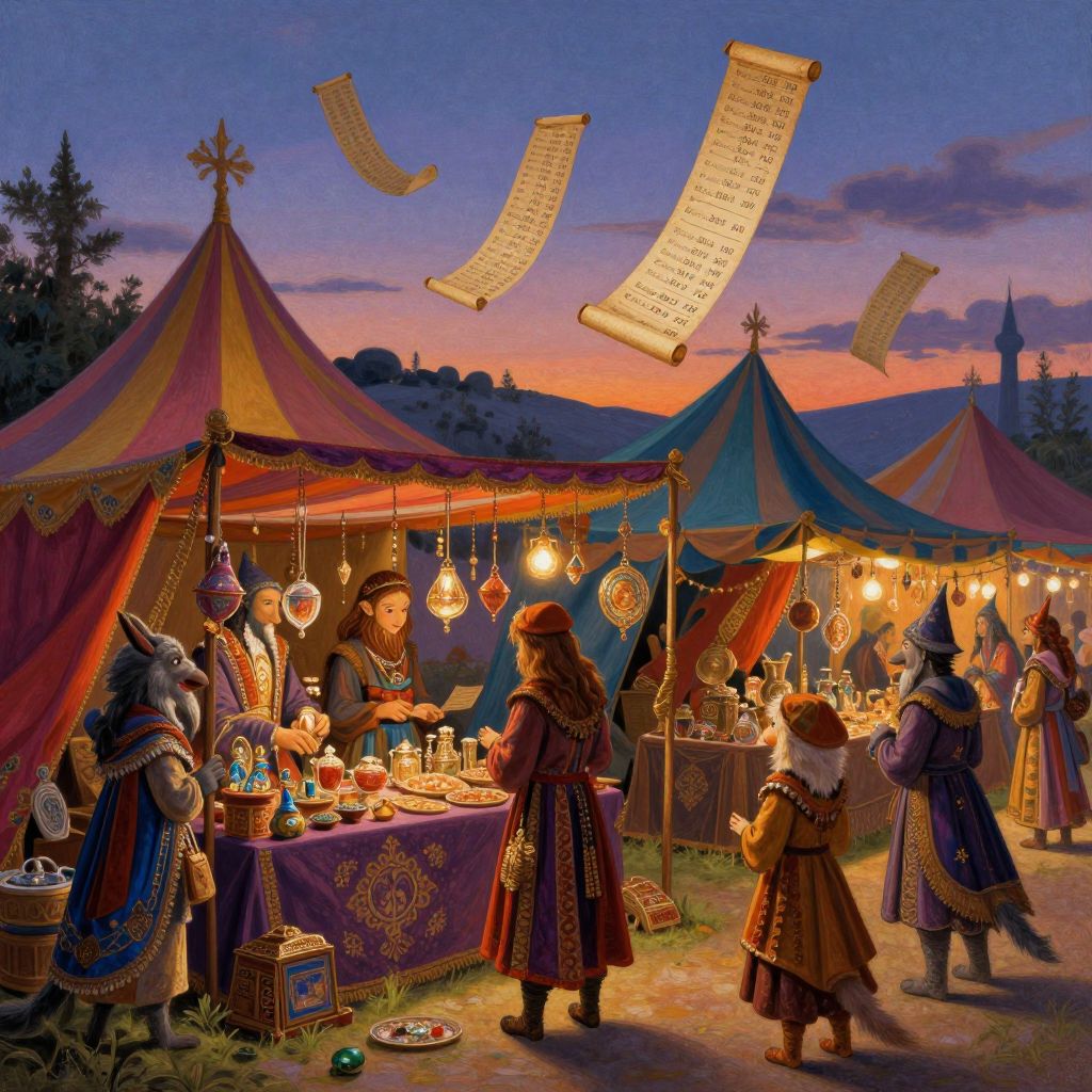 Fantastical medieval market at dusk, colorful tents, illuminated lanterns, costumed vendors and buyers, scrolls floating in the sky, vibrant sunset background