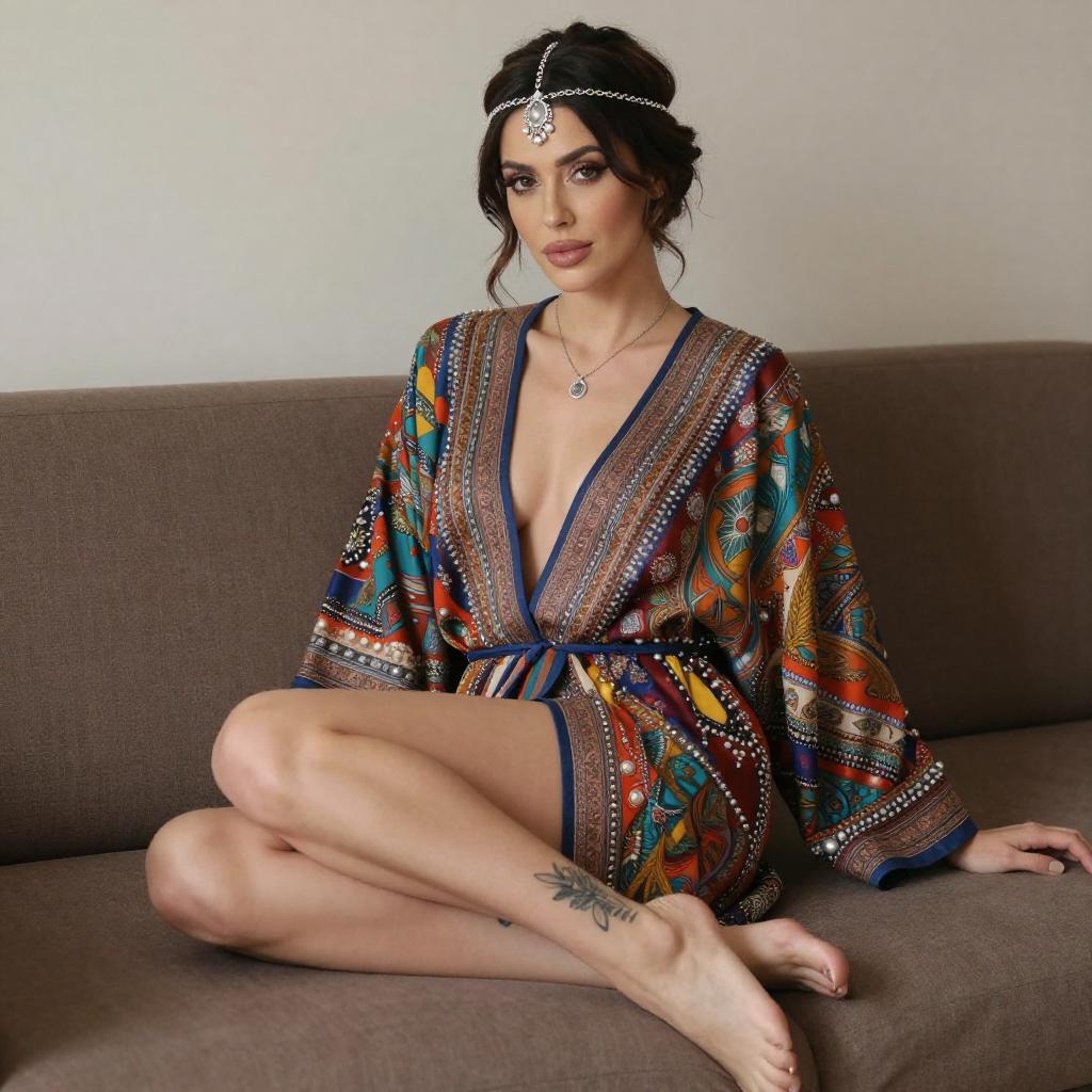 A photograph of a woman with fair skin and dark hair in an updo, wearing an ornate, colorful, deep V-neck robe with intricate patterns and silver beads. She sits on a brown sofa, legs crossed, showing a tattoo on her right ankle. She wears a silver headpiece and necklace, with a confident expression.
