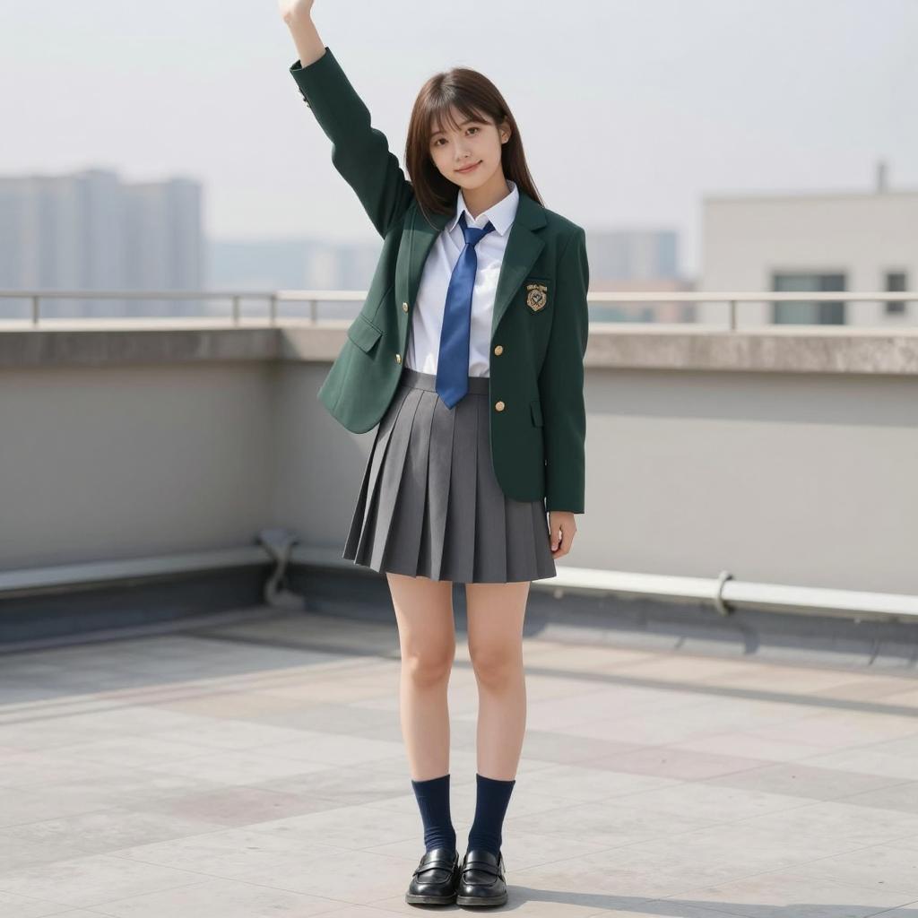 Young Asian woman standing on train platform. Arms raised above head, smiling. Wearing white short-sleeve shirt, blue plaid skirt, black loafers, white socks. Black backpack on right shoulder. Background: train tracks, blurred buildings, yellow tactile paving. Natural light.