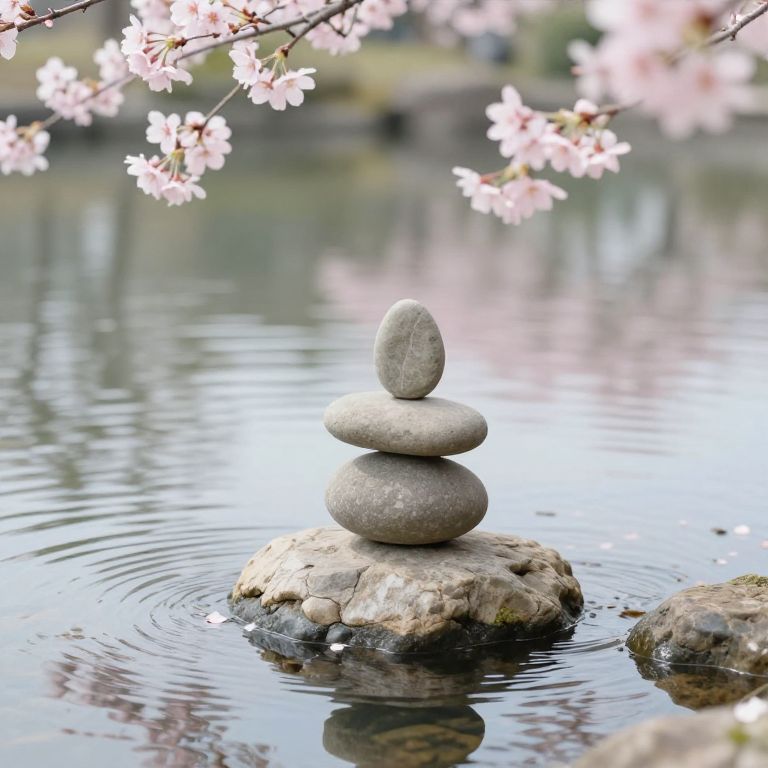 Photograph of a serene scene featuring three smooth, gray stones stacked in a balanced, teetering pile on a moss-covered rock in a calm, reflective pond. Above, delicate pink cherry blossom branches with soft, out-of-focus flowers frame the top. The water ripples gently around the rock, creating a peaceful ambiance. The background is a blur of greenery and more distant water, enhancing the tranquil, natural setting. The overall composition evokes a sense of balance and calmness.
