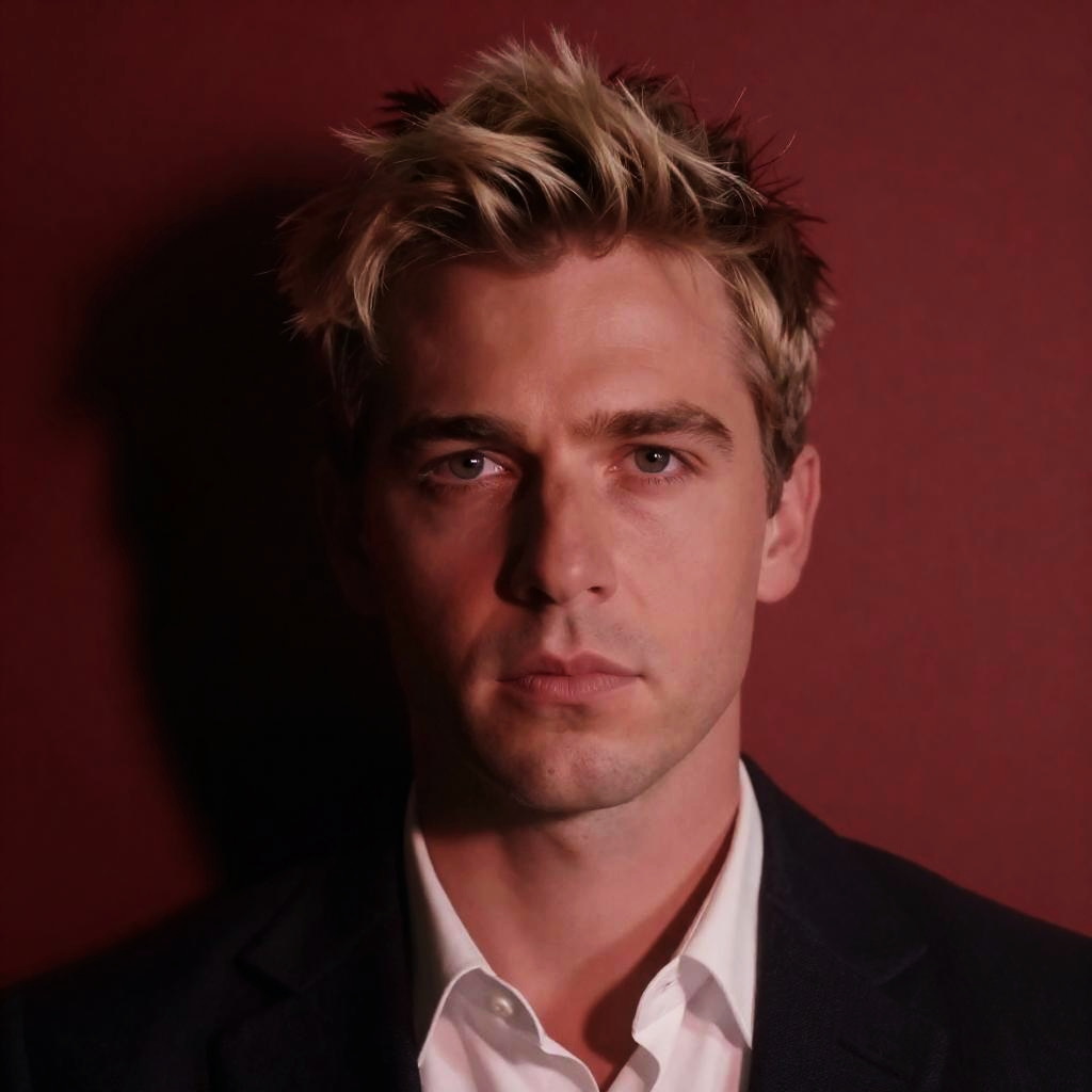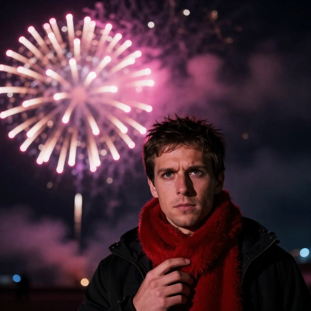 Photograph of a man with short brown hair, intense expression, holding a furry red object, surrounded by vibrant pink and purple fireworks. Nighttime sky background. Man wears dark jacket. Fireworks fill left and top of frame.