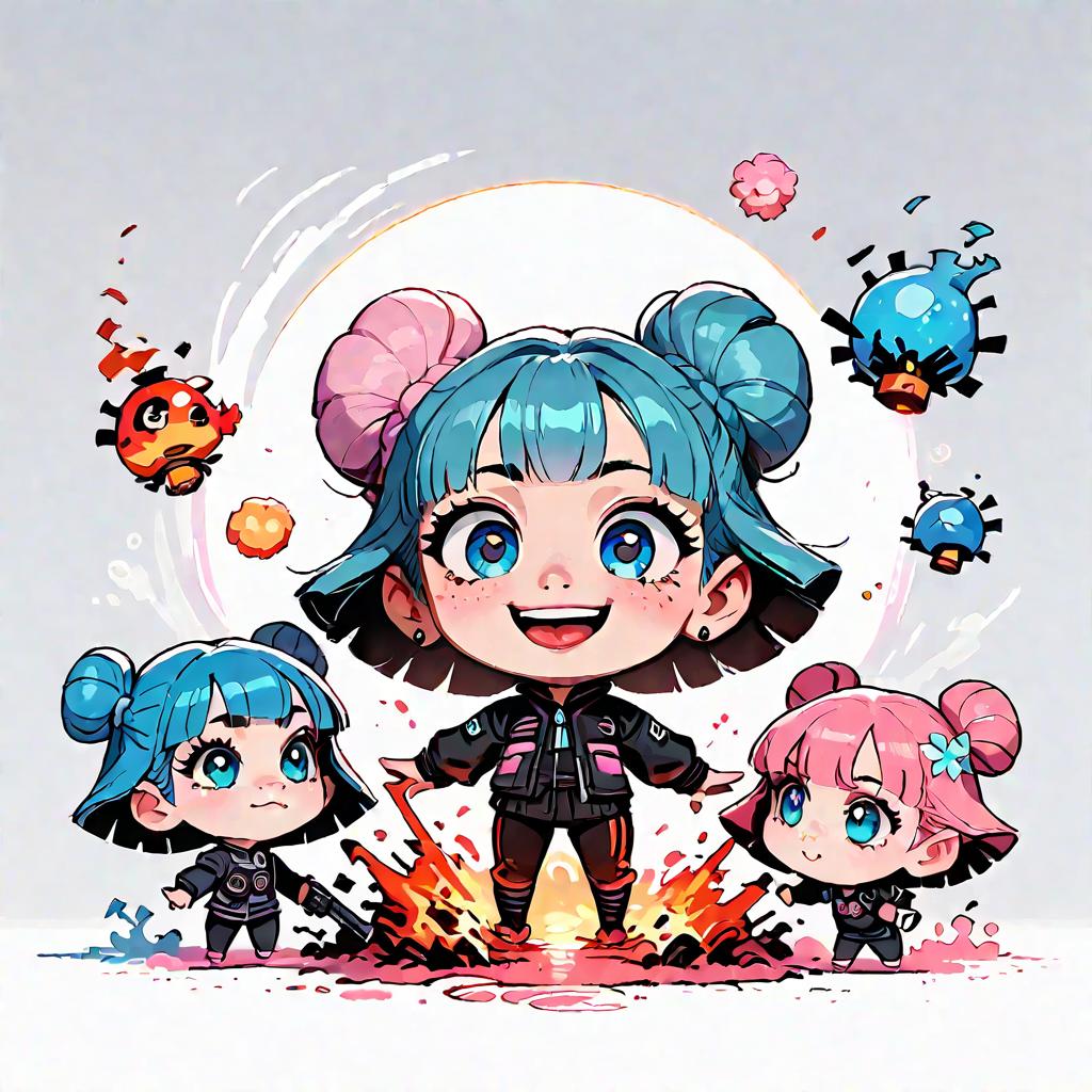 Score_9, score_8_up, score_7_up, female, source_cartoon, (Bubbles_ppg), (Blossom_ppg), (Buttercup_ppg), short, chibi, (3girls), holding pistol each one, (Explosions in the background), crazy_smile
