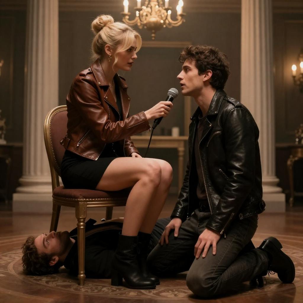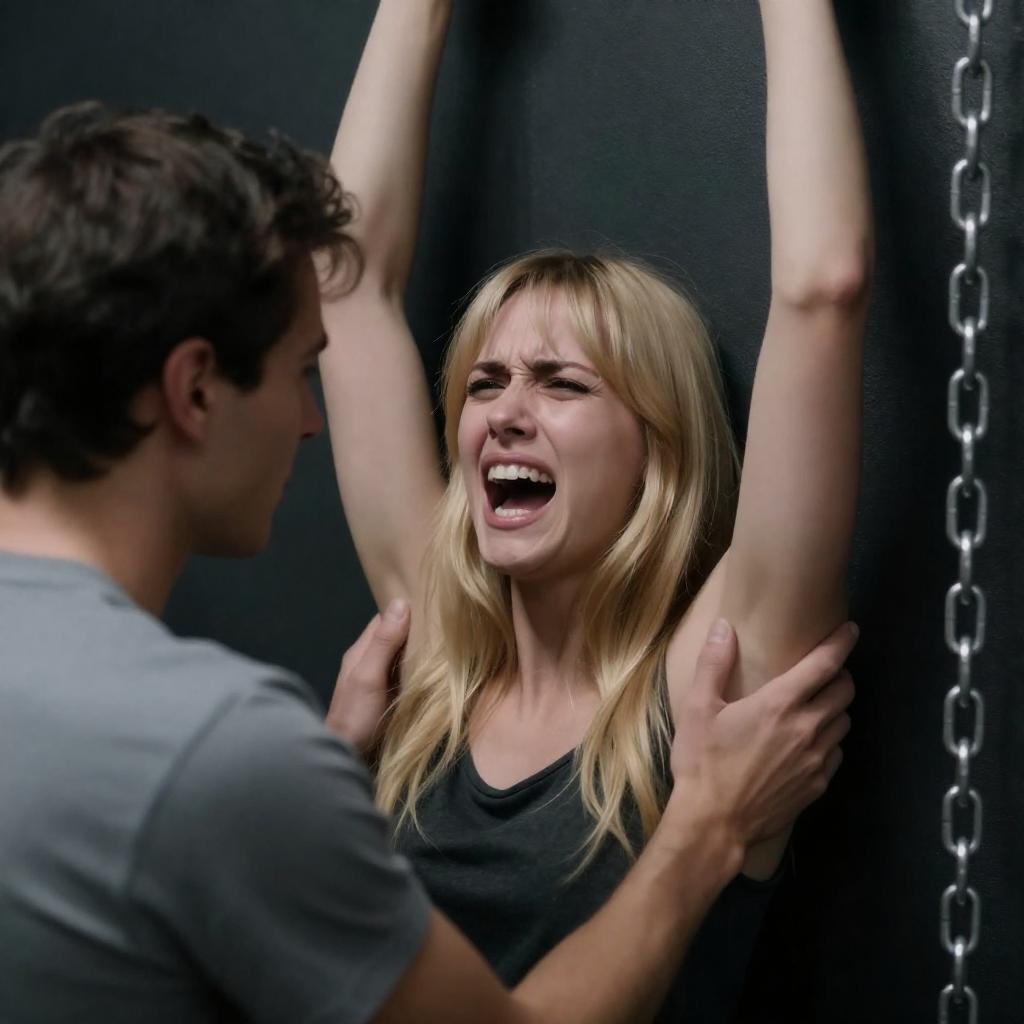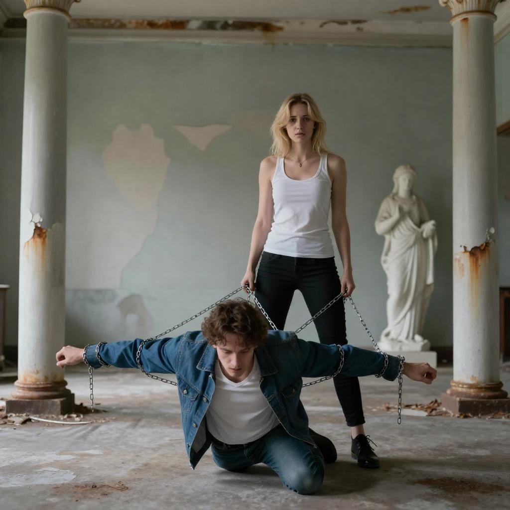 Photograph of a distressed, abandoned room with peeling paint and rusted columns. A woman with blonde hair, wearing a white tank top and black pants, holds chains attached to a bound man in a blue jacket and jeans. A white statue stands in the background. The woman stands confidently, while the man is restrained, arms outstretched.