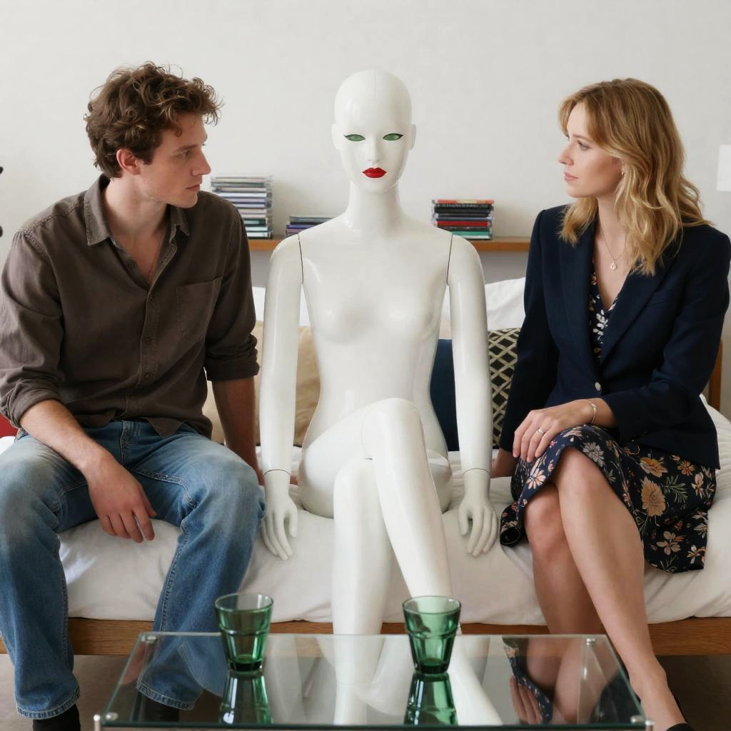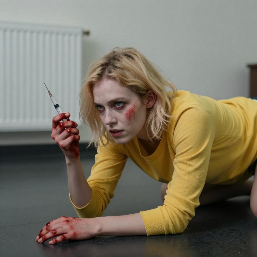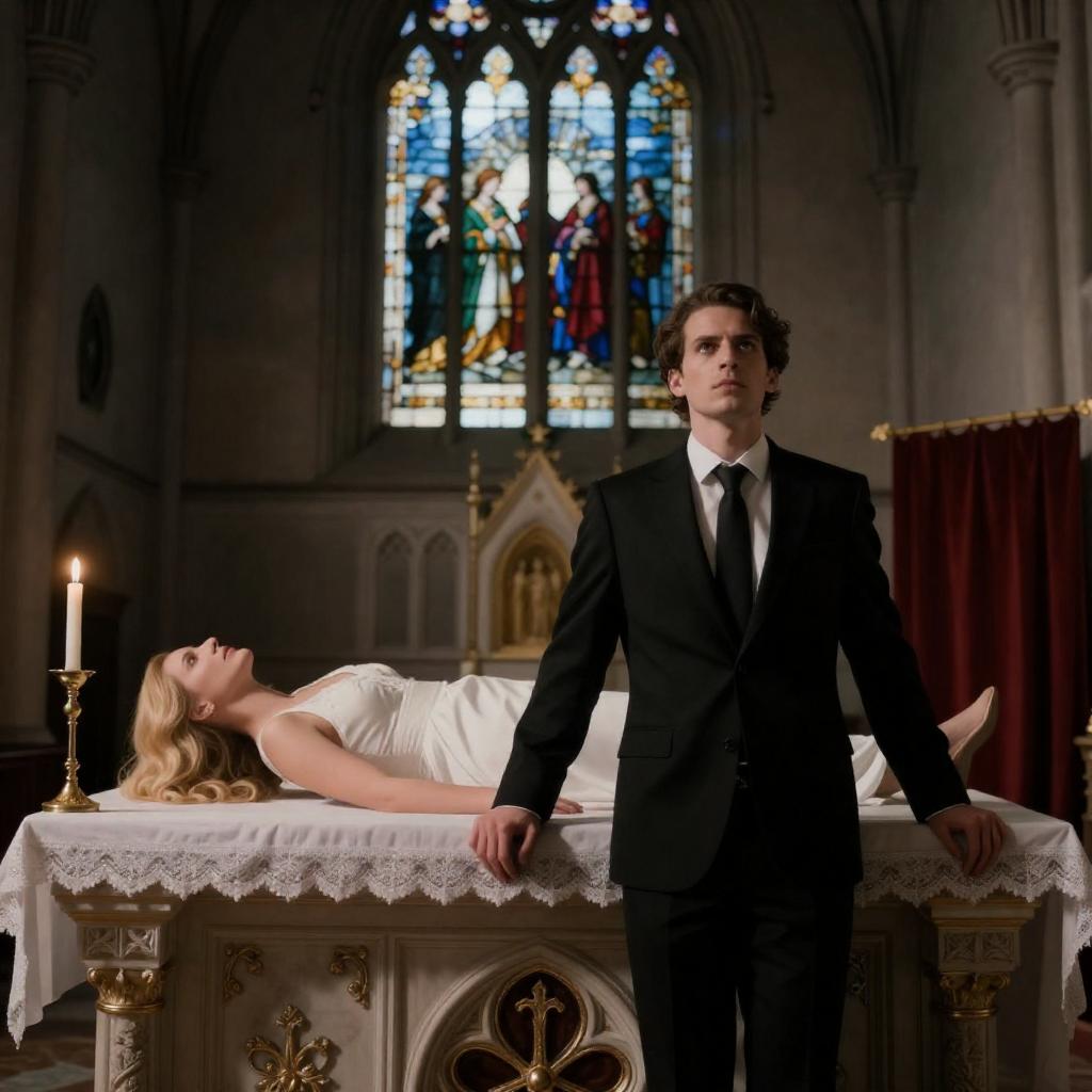 Photograph of a distressed, abandoned room with peeling paint and rusted columns. A woman with blonde hair, wearing a white tank top and black pants, holds chains attached to a bound man in a blue jacket and jeans. A white statue stands in the background. The woman stands confidently, while the man is restrained, arms outstretched.