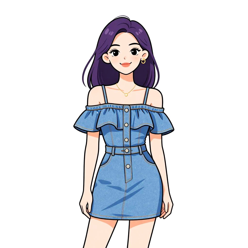 This is a digital illustration of a smiling young woman with straight, shoulder-length purple hair. She wears a light blue, short-sleeved, V-neck dress adorned with yellow and white daisy-like patterns. The dress has a subtle ruffle at the hem and a tied bow at the waist. Her skin is fair, and she has dark brown eyes. The background is plain white, making her the focal point. The art style is vibrant and cartoonish, with bold colors and clean lines.