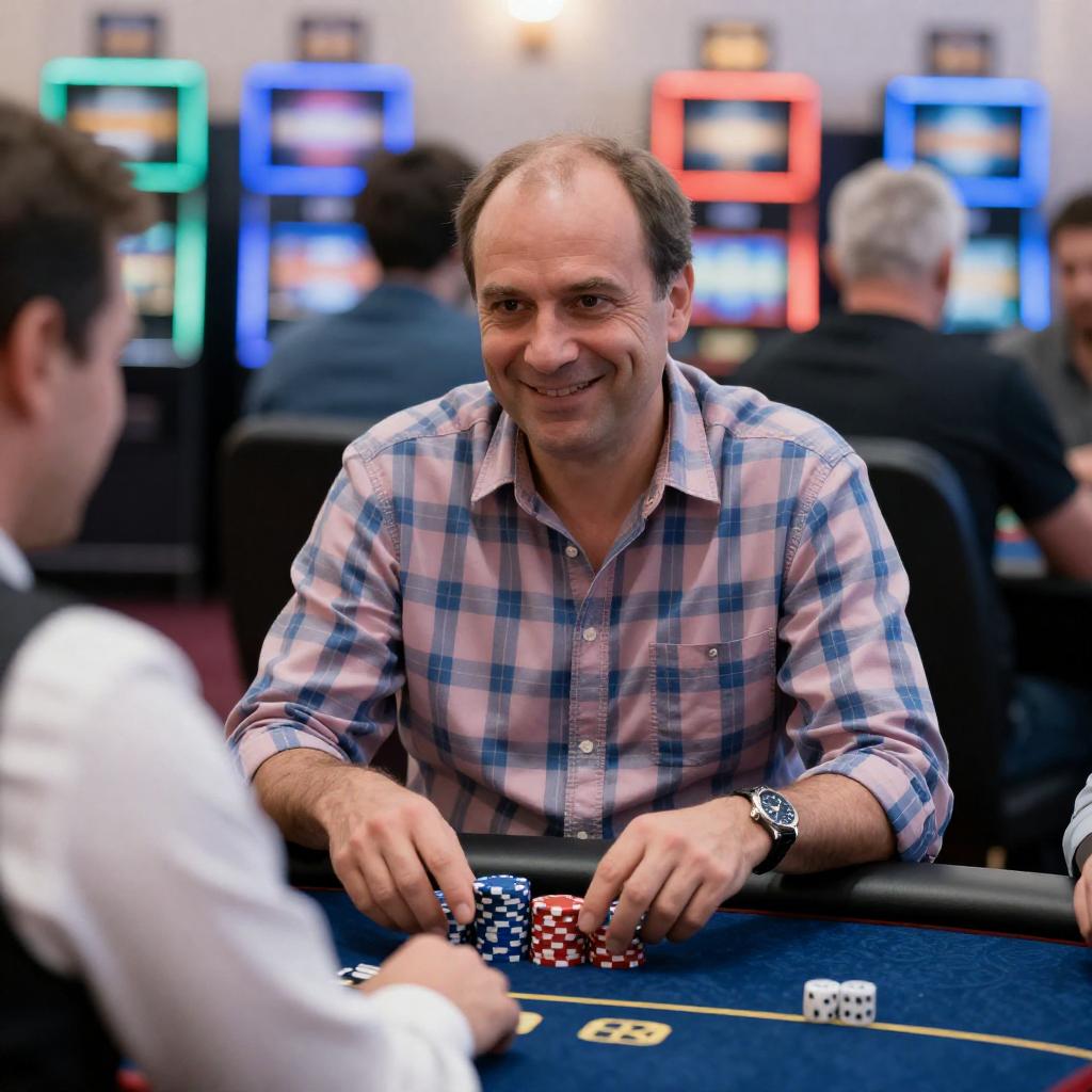 Photograph of a middle-aged man with receding brown hair, wearing a pink and blue plaid shirt, smiling while gesturing with both hands at a poker table. Another man in a white shirt and black vest is partially visible in the foreground. Background includes several blurred people and brightly lit slot machines. Poker chips and a poker dice set are on the table. The setting is a busy casino.
