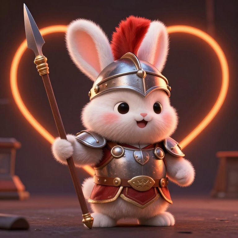 CGI image of an adorable, white-furred bunny in medieval armor with a red plume helmet, holding a spear, against a glowing heart-shaped