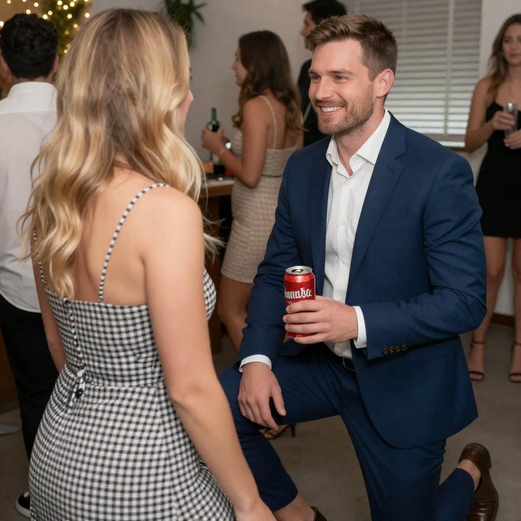Photograph of a man in a blue suit kneeling and holding a red drink can, smiling at a blonde woman in a black-and-white checkered dress. Background includes a group of people, festive decorations, and a window with blinds. The man is in the foreground, right, while the woman is in the foreground, left.