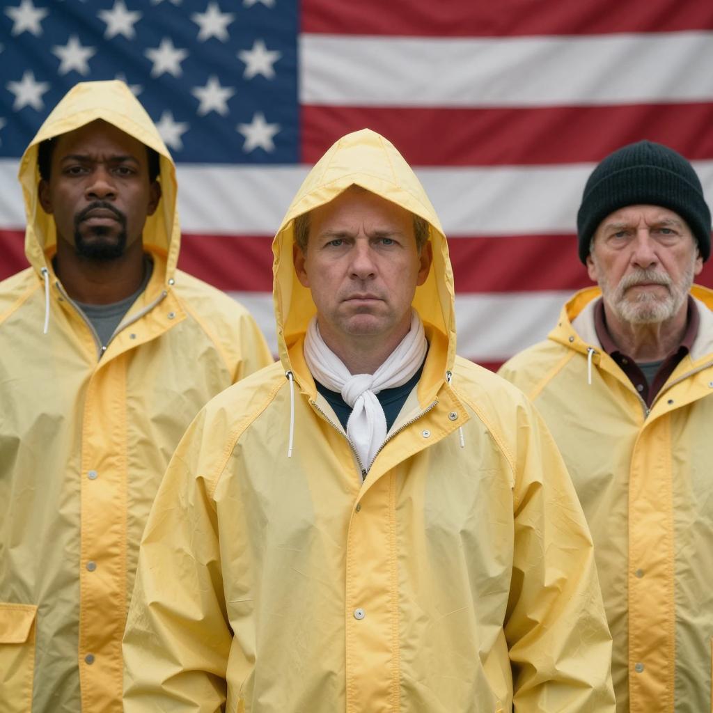 Three men in blue prison uniforms stand behind a metal railing. The man on the left raises his arm, the middle man has a stern expression, and the right man with a red beard and tattooed arm looks forward. Background includes chain-link fence and dim lighting.