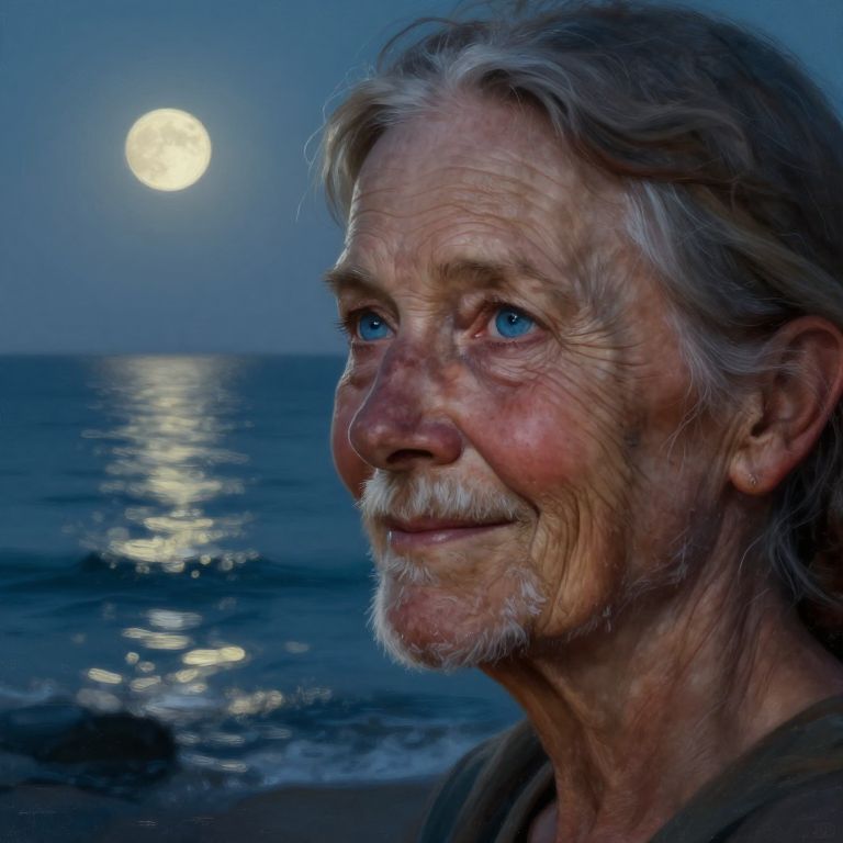 Craft a photorealistic digital painting portrait of an elderly girl with a shy smile and piercing blue eyes. Capture her from an unconventional angle, as if through shimmering sea reflections, to evoke an ethereal atmosphere. In this close-up view, emphasize the intricate details of her rugged face, lined skin, and salt-tinged beard under soft moonlight that illuminates her determined expression. This creates a sense of introspection and nostalgia as she gazes upon the vast ocean.