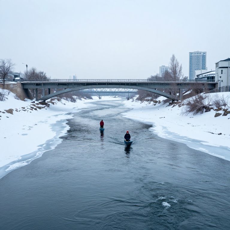 Photograph of a snowy winter scene featuring two people standing in a partially frozen river. The individuals, one in a red coat and the other in a black coat, are centered in the image, surrounded by snow-covered banks. An arched concrete bridge spans the background, with leafless trees and a few modern buildings visible. The sky is overcast, casting a grayish light over the scene. The river's surface is dark and reflective, with patches of ice visible along the edges. The overall color palette is dominated by whites, grays, and blues.