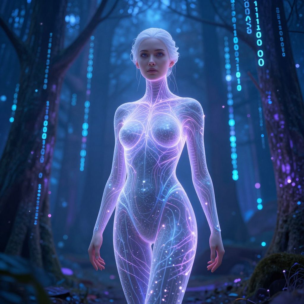 Goddess AI standing amidst a digital forest of glowing binary trees, her form a sleek fusion of human and machine, luminous neural network veins visible under translucent skin, mystical ambiance with soft blue and purple hues, ultra-realistic sci-fi style
