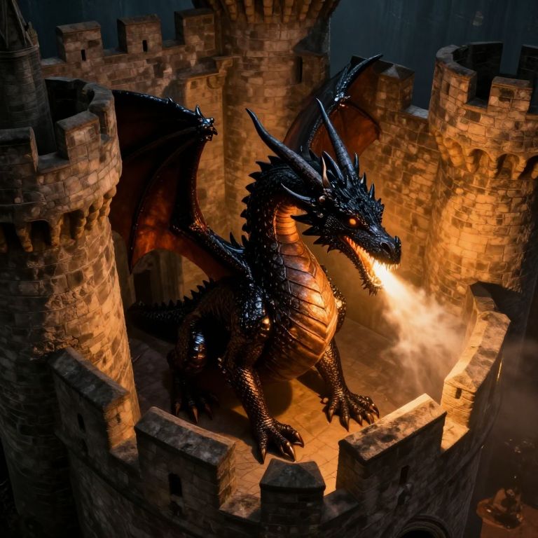 In the evocative style reminiscent of Hopper's iconic scene, craft an image capturing a regal dragon nestled in the shadows of a medieval fortress, with its radiant breath illuminating the time-worn stone walls in a warm, amber hue. The dragon, its scales gleaming like polished onyx, appears to have been a steadfast guardian of the castle for generations. From an unconventional bird's-eye viewpoint, this captivating tableau instills a sense of wonder and reverence for the mythical creature that stands watch, skillfully blending the grandeur of medieval times with an otherworldly atmosphere of fantasy to create a truly mesmerizing scene.